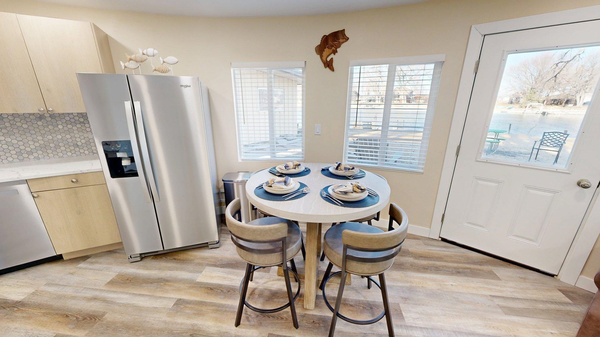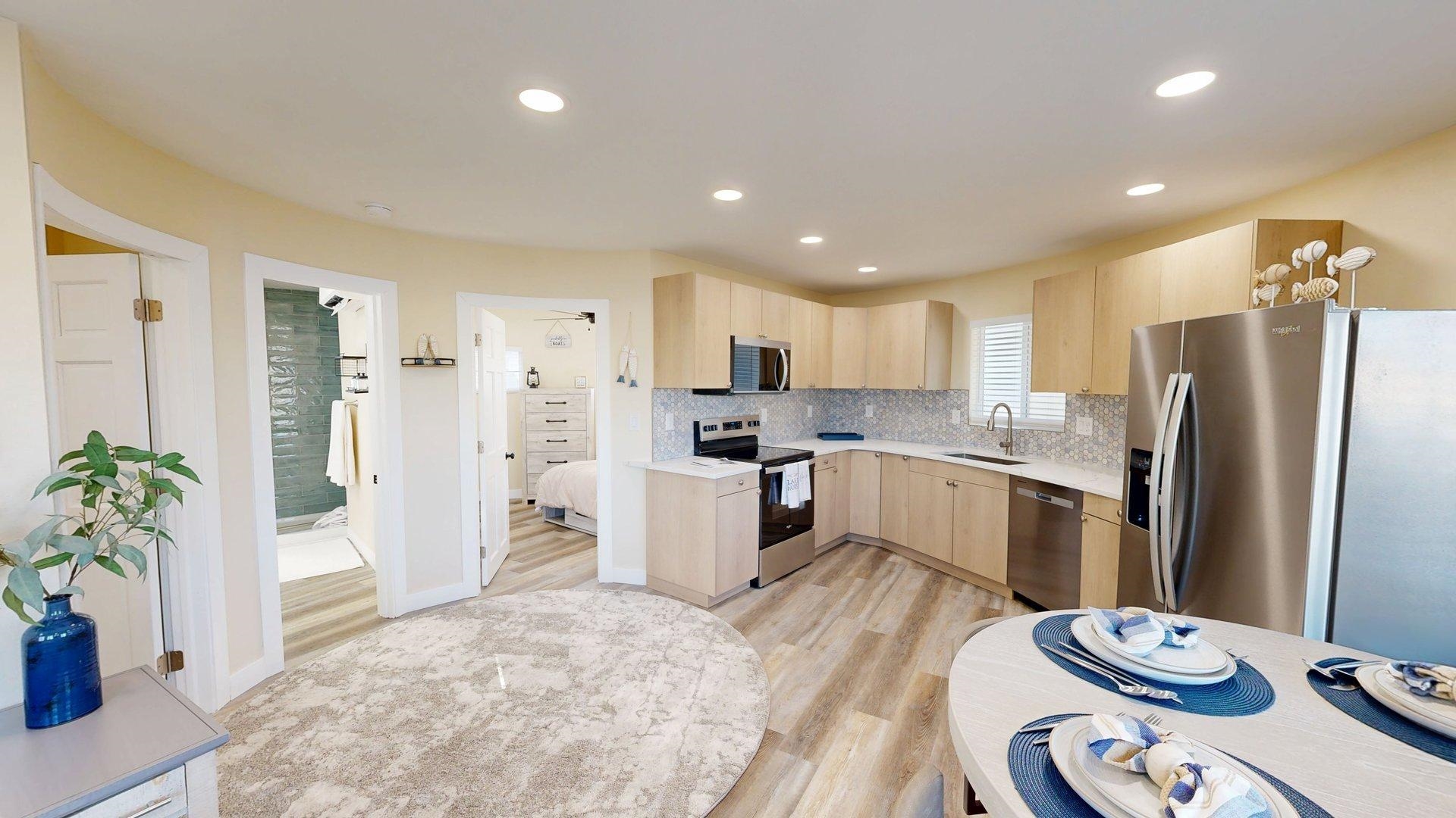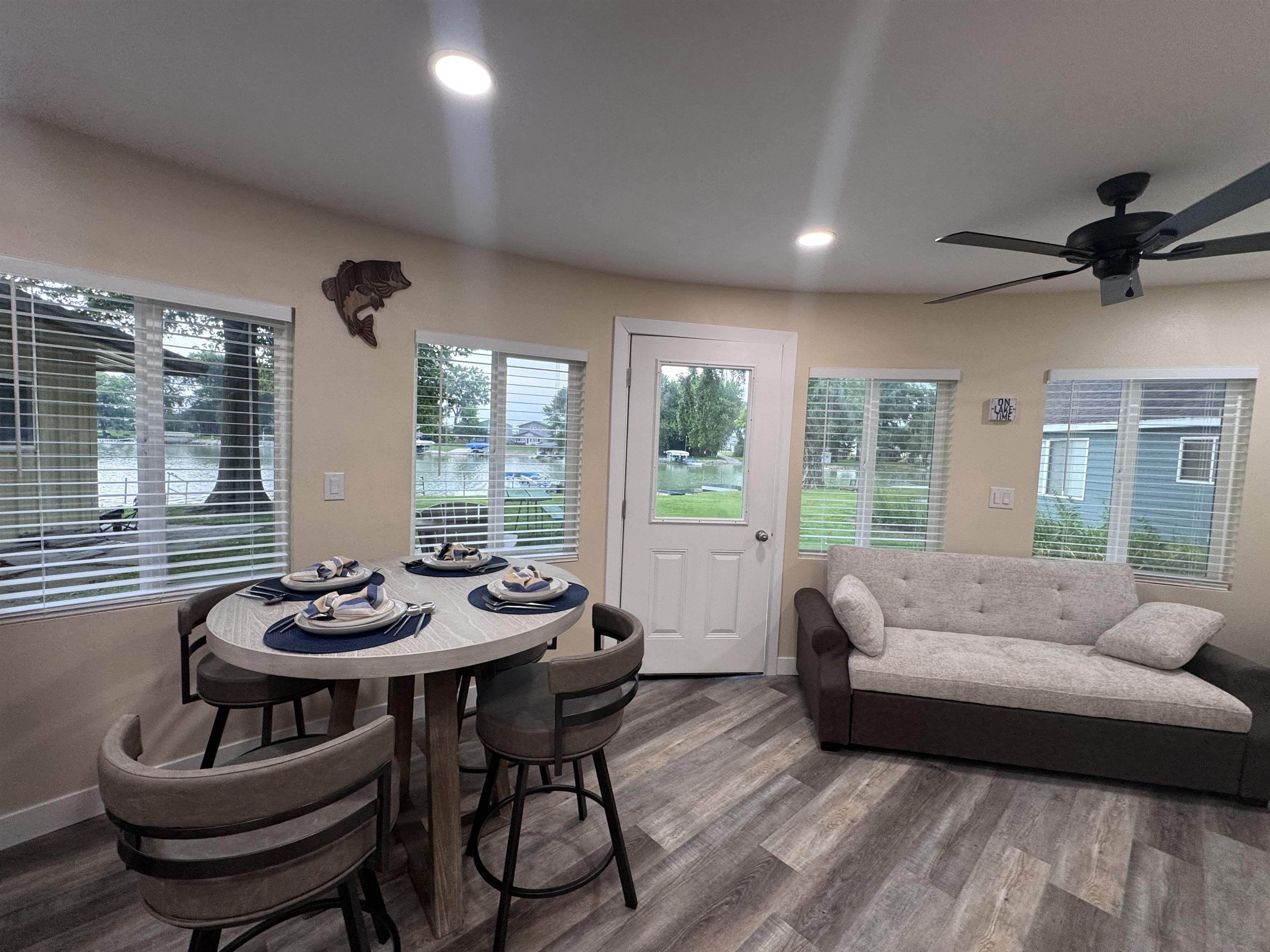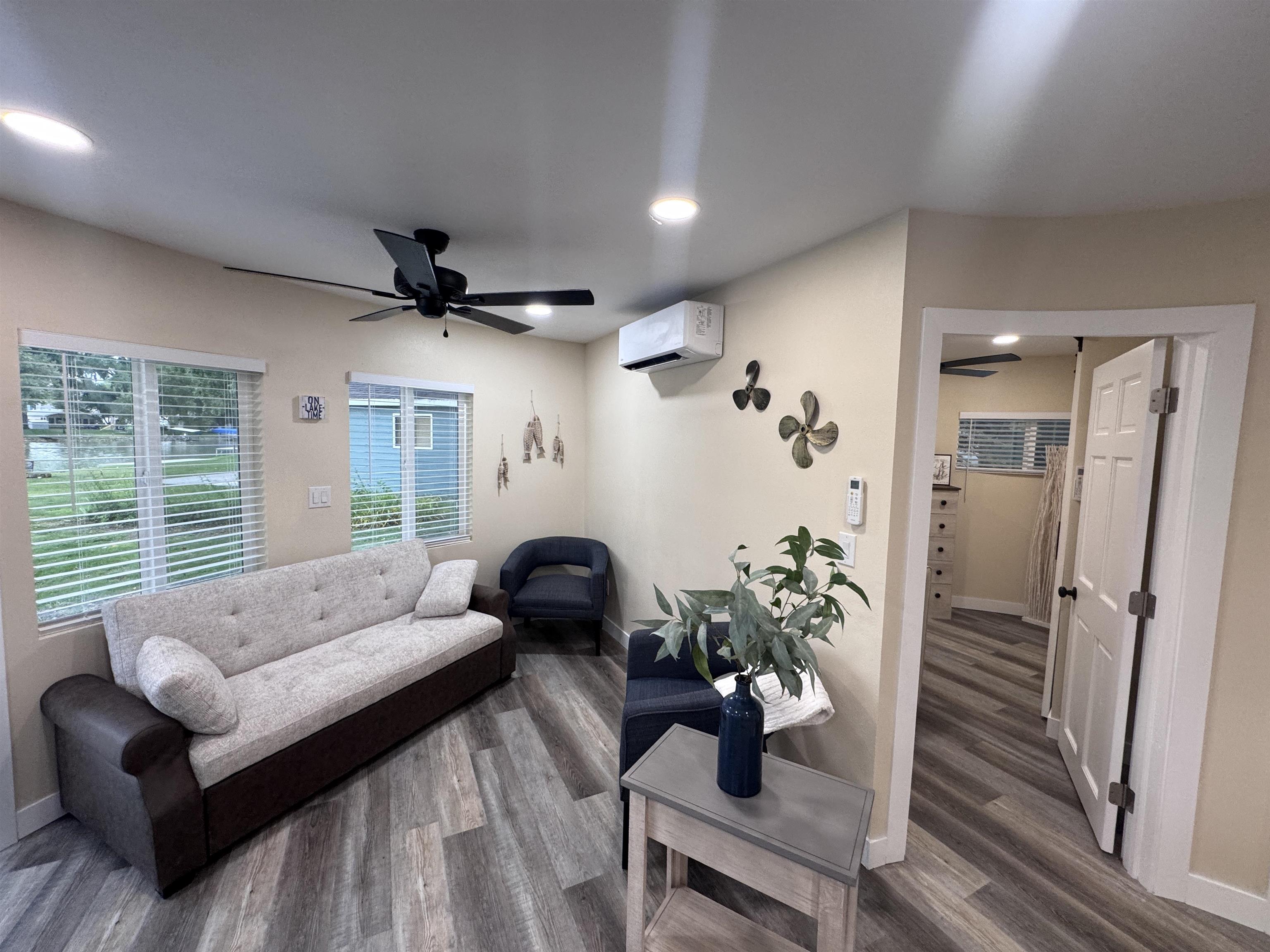 Modern comfort meets lakeside charm in this completely reimagined round cabin on Mallard South Bay. Once a rustic hideaway, this home has been thoughtfully rebuilt from top to bottom and is being sold fully furnished. From the fresh exterior siding and new windows to the efficient mini-split heating and cooling systems, every detail has been upgraded with comfort and style in mind. Inside, the open-concept layout features all-new flooring and a bright, inviting atmosphere. The modern kitchen includes stone countertops, brand-new appliances, and thoughtful design details. The updated bathroom offers a tiled shower, contemporary finishes, and a convenient stackable washer and dryer. Two bedrooms and an open living space provide comfortable sleeping arrangements for up to six guests. A deep lot provides room to relax or entertain, with a newly poured concrete pad under the attached carport, a fresh gravel driveway, and a wraparound sidewalk leading to the welcoming front patio. A brand-new floating dock is ready for lake season, and the 50-amp hookup on the back of the home makes it easy to host guests with a camper or motorhome. Located in a peaceful no-wake cove, this property offers ideal conditions for swimming, kayaking, paddleboarding, and easy access to the main lake. This is a rare opportunity to own a fully rebuilt, turnkey cabin at Johnson Lake.