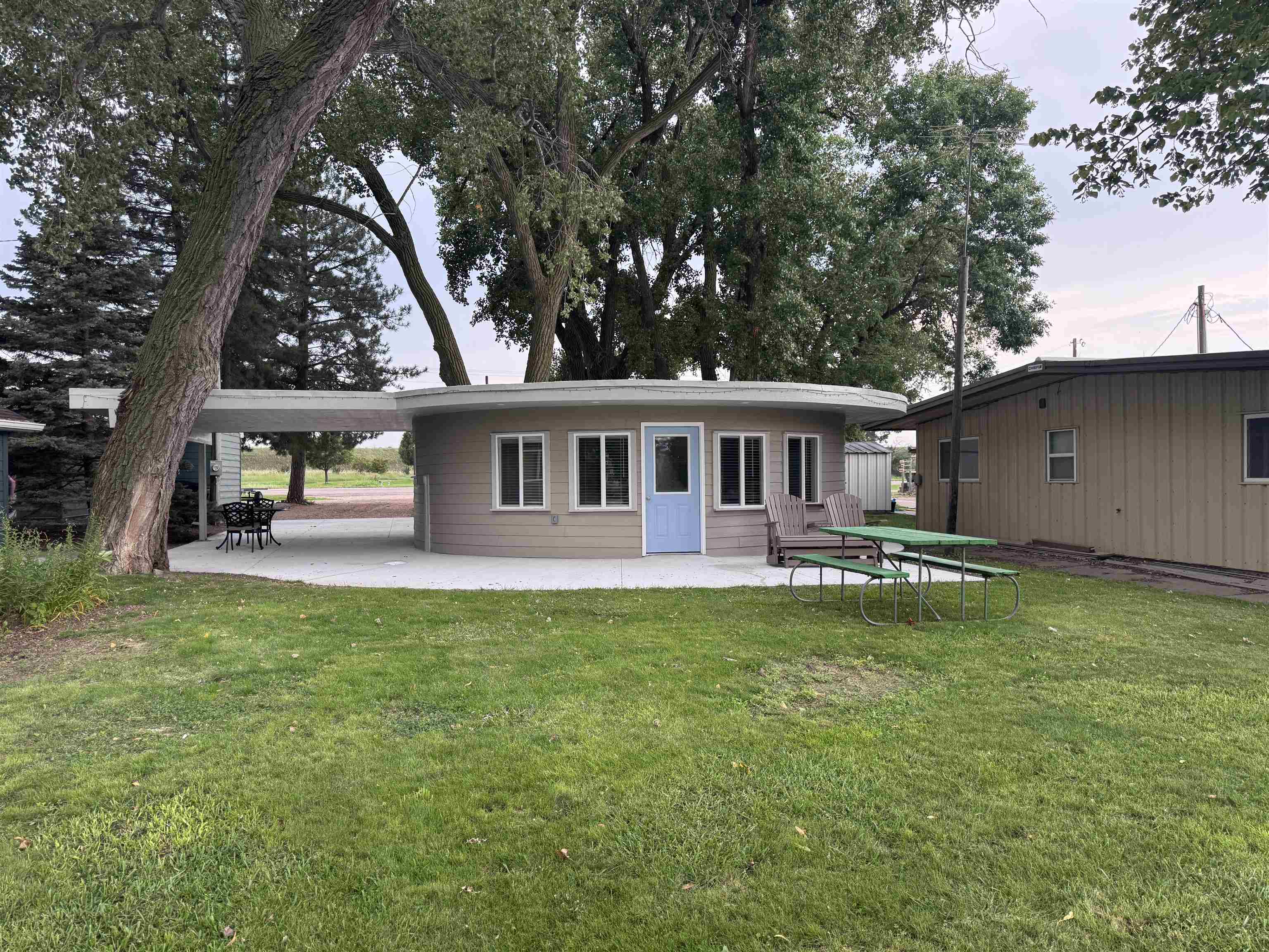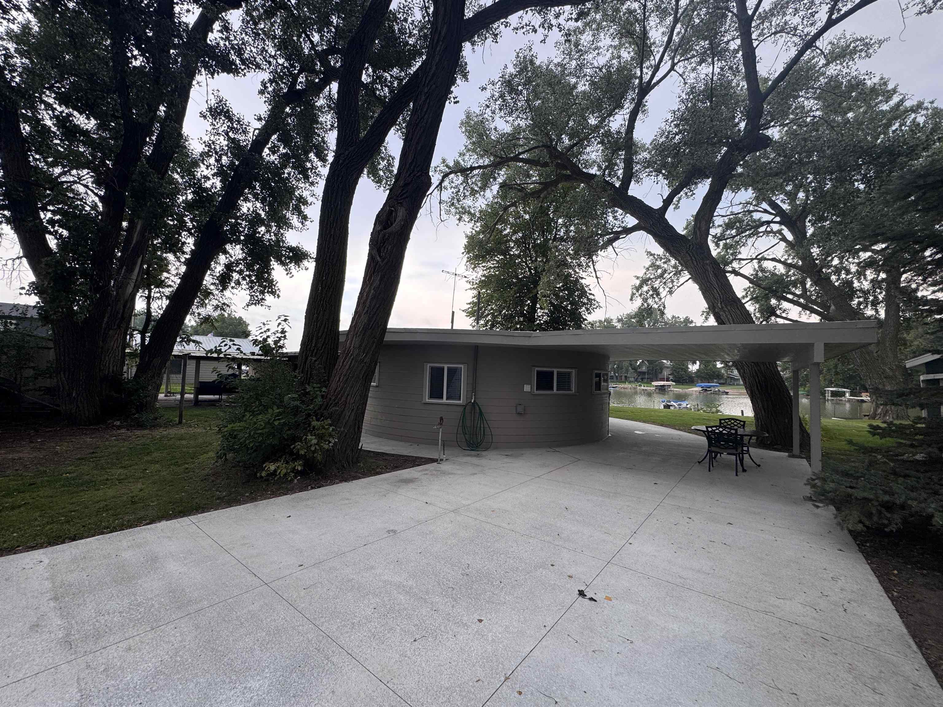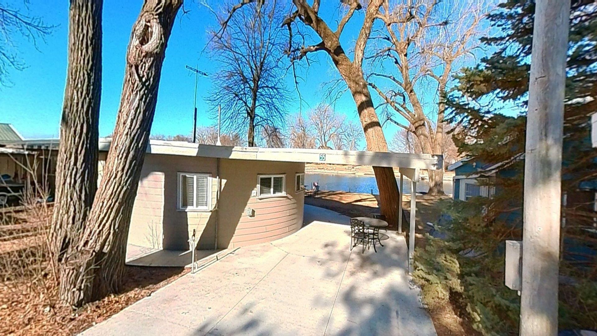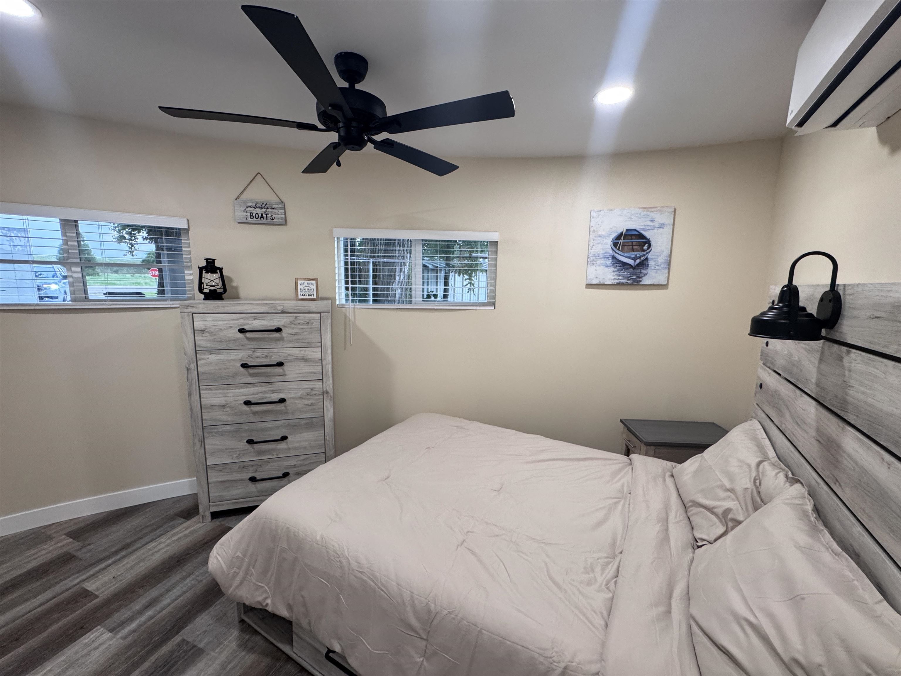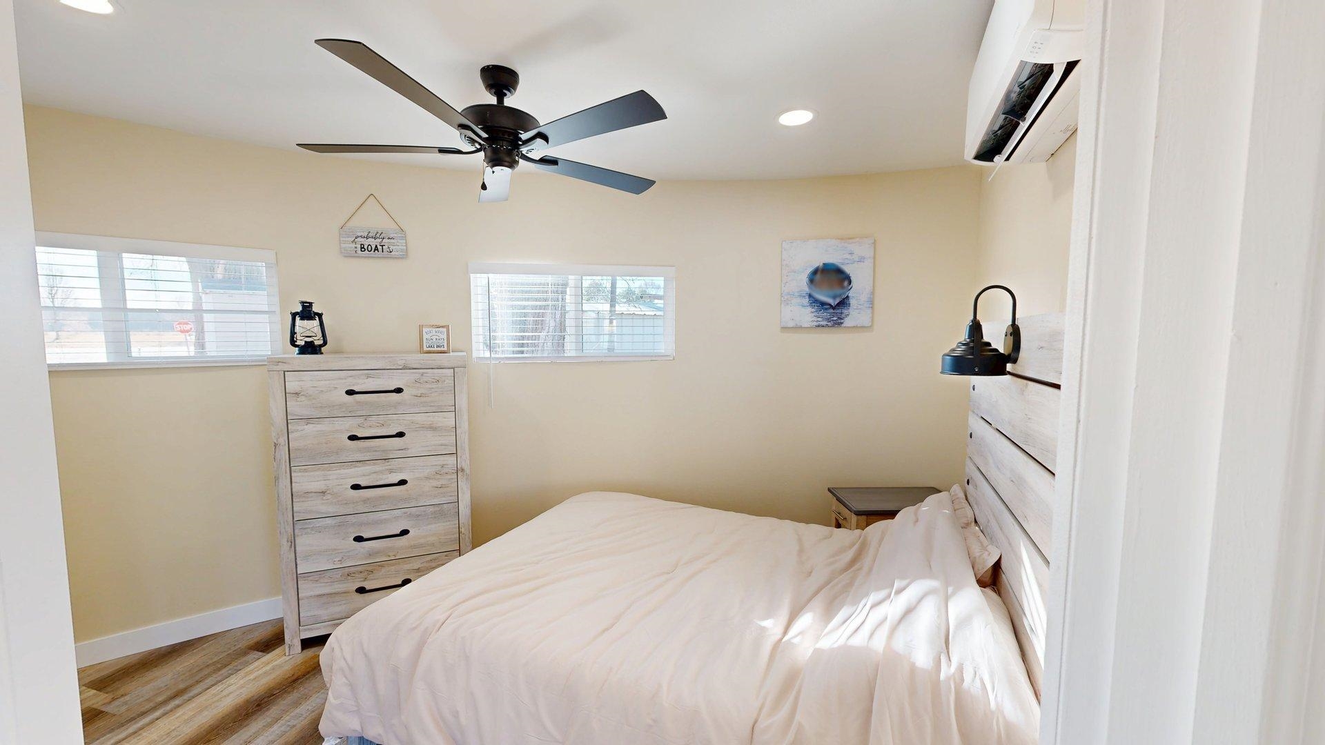 Modern comfort meets lakeside charm in this completely reimagined round cabin on Mallard South Bay. Once a rustic hideaway, this home has been thoughtfully rebuilt from top to bottom and is being sold fully furnished. From the fresh exterior siding and new windows to the efficient mini-split heating and cooling systems, every detail has been upgraded with comfort and style in mind. Inside, the open-concept layout features all-new flooring and a bright, inviting atmosphere. The modern kitchen includes stone countertops, brand-new appliances, and thoughtful design details. The updated bathroom offers a tiled shower, contemporary finishes, and a convenient stackable washer and dryer. Two bedrooms and an open living space provide comfortable sleeping arrangements for up to six guests. A deep lot provides room to relax or entertain, with a newly poured concrete pad under the attached carport, a fresh gravel driveway, and a wraparound sidewalk leading to the welcoming front patio. A brand-new floating dock is ready for lake season, and the 50-amp hookup on the back of the home makes it easy to host guests with a camper or motorhome. Located in a peaceful no-wake cove, this property offers ideal conditions for swimming, kayaking, paddleboarding, and easy access to the main lake. This is a rare opportunity to own a fully rebuilt, turnkey cabin at Johnson Lake.