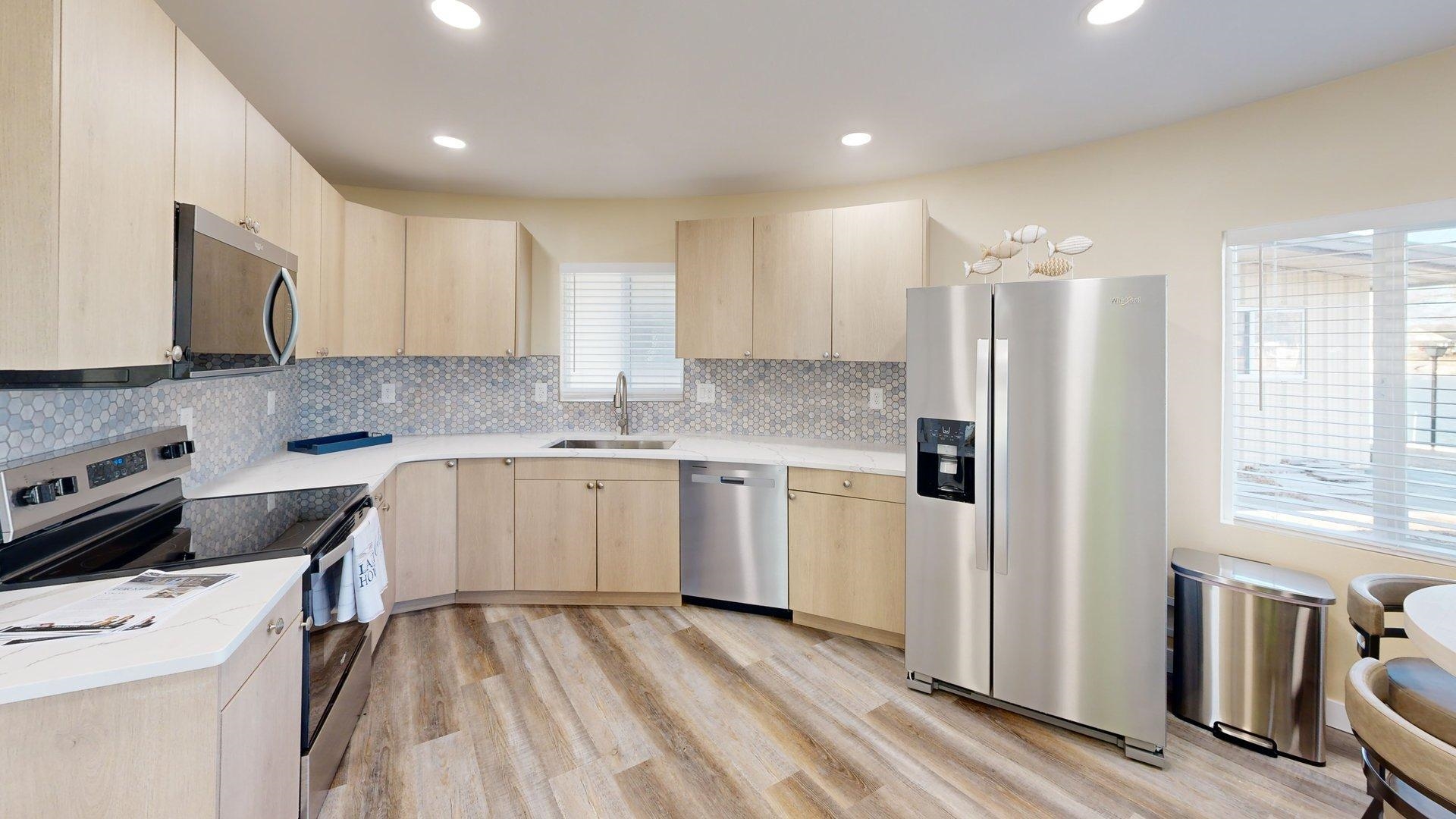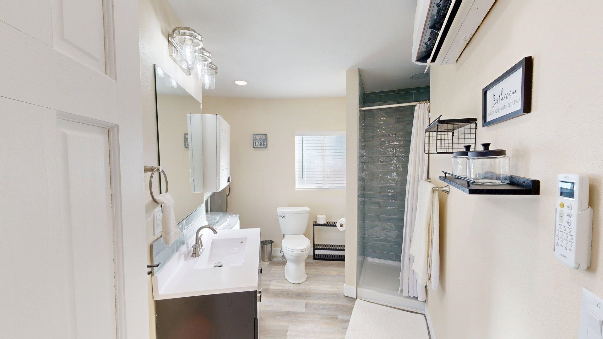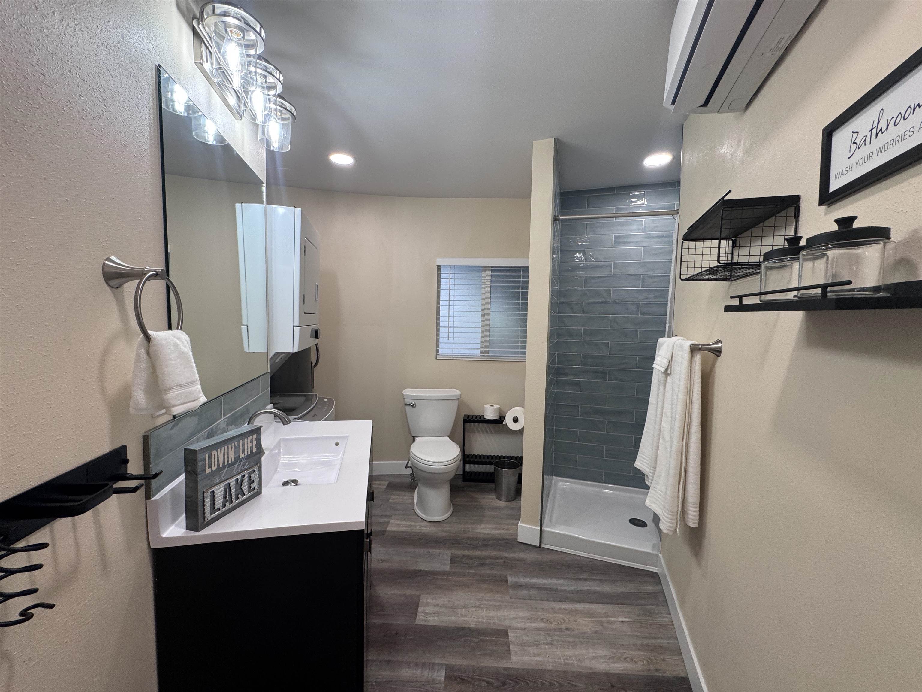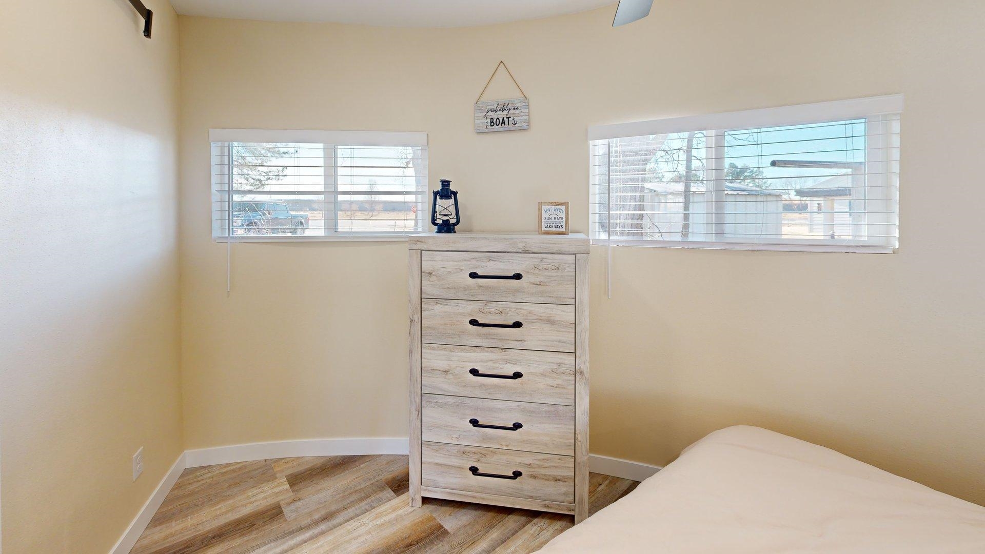 Modern comfort meets lakeside charm in this completely reimagined round cabin on Mallard South Bay. Once a rustic hideaway, this home has been thoughtfully rebuilt from top to bottom and is being sold fully furnished. From the fresh exterior siding and new windows to the efficient mini-split heating and cooling systems, every detail has been upgraded with comfort and style in mind. Inside, the open-concept layout features all-new flooring and a bright, inviting atmosphere. The modern kitchen includes stone countertops, brand-new appliances, and thoughtful design details. The updated bathroom offers a tiled shower, contemporary finishes, and a convenient stackable washer and dryer. Two bedrooms and an open living space provide comfortable sleeping arrangements for up to six guests. A deep lot provides room to relax or entertain, with a newly poured concrete pad under the attached carport, a fresh gravel driveway, and a wraparound sidewalk leading to the welcoming front patio. A brand-new floating dock is ready for lake season, and the 50-amp hookup on the back of the home makes it easy to host guests with a camper or motorhome. Located in a peaceful no-wake cove, this property offers ideal conditions for swimming, kayaking, paddleboarding, and easy access to the main lake. This is a rare opportunity to own a fully rebuilt, turnkey cabin at Johnson Lake.