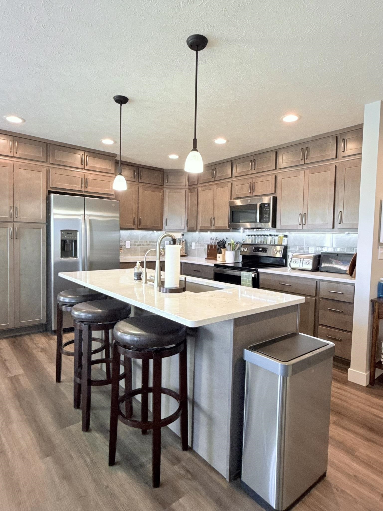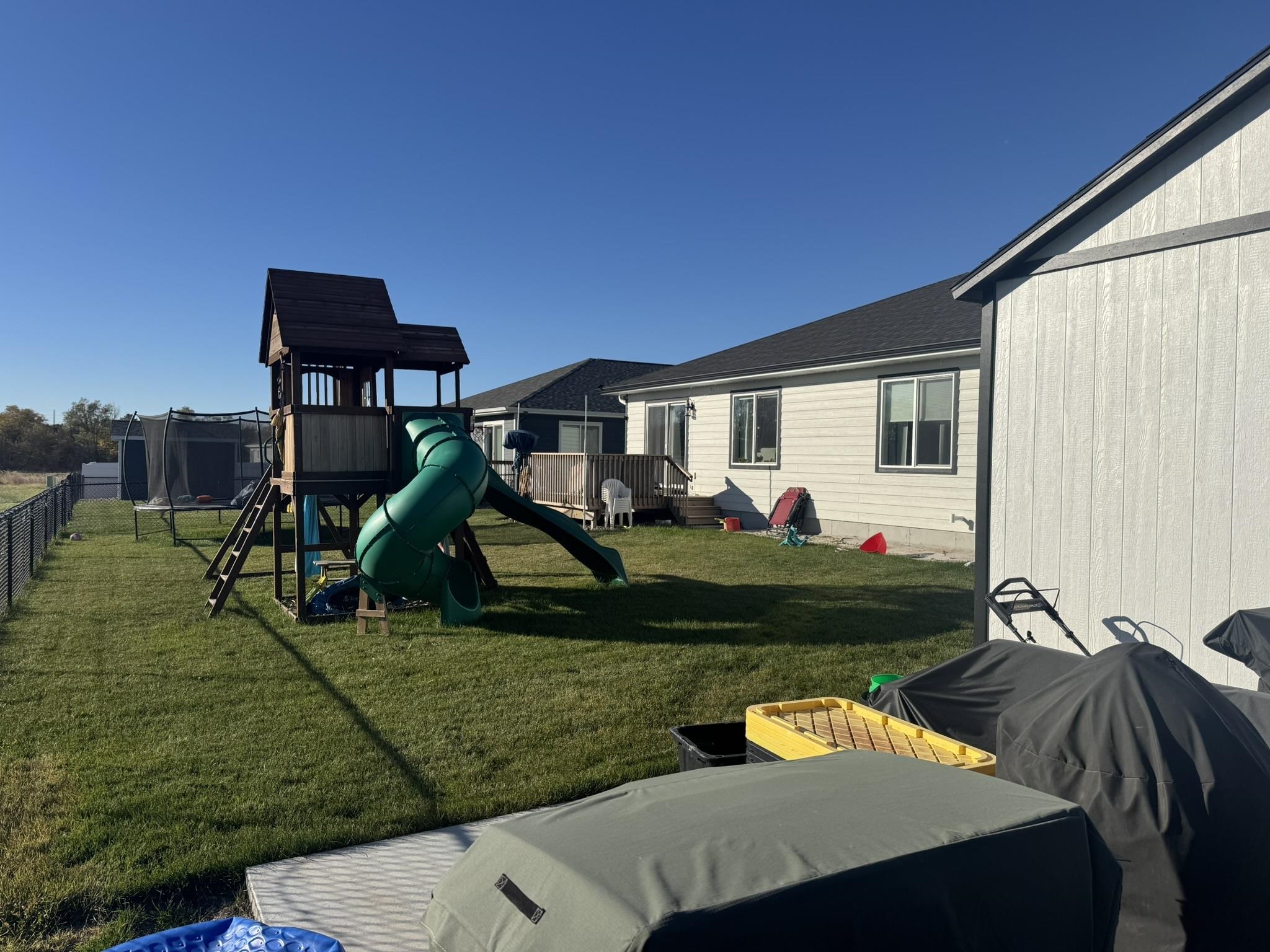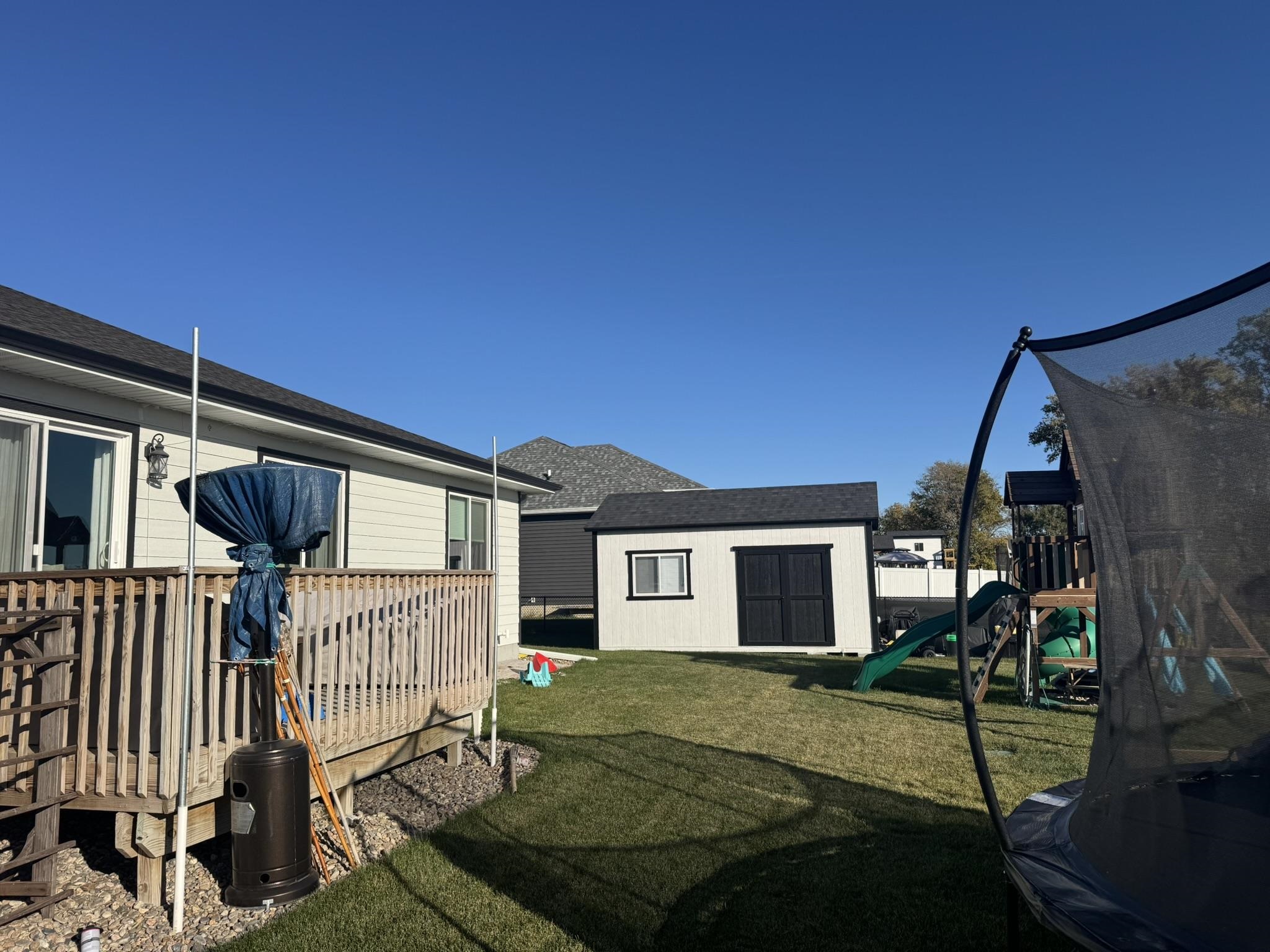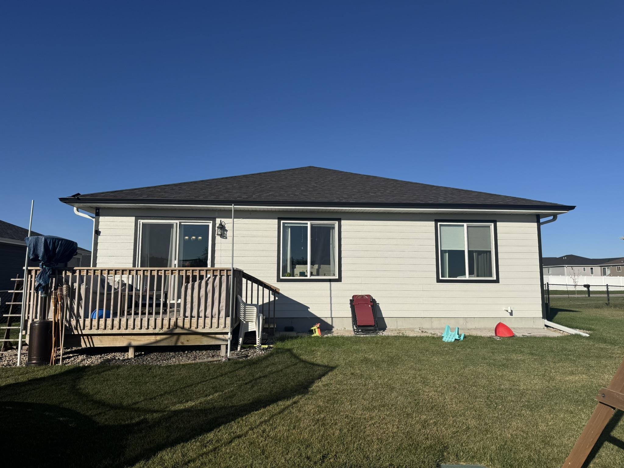 This pristine 2023-built residence showcases an expansive open-concept main level where the gourmet kitchen, dining, and living areas flow seamlessly. Perfect for entertaining or everyday living. The kitchen impresses with sleek cabinetry extended to the ceiling for abundant storage and a refined, custom look. Step out onto the spacious rear deck and soak in breathtaking sunrise views that elevate every morning. The main level also features a convenient laundry room, two well-appointed bedrooms, and two bathrooms. Downstairs, the fully finished basement boasts tall ceilings, plush carpeting, a large storage area, two additional conforming bedrooms, and a full bath. Ideal for guests, a home office, or whatever you needs might be. Outdoor living is a dream with a fully fenced backyard, a brand-new 20x12 shed for extra storage or hobbies, and a generous concrete patio perfect for grilling. The attached 2-car garage offers convenience and security, while vibrant Govee exterior lighting enhances curb appeal day or night. Meticulously maintained and loaded with upgrades, this move-in-ready gem combines contemporary style, functional layout, and outdoor enjoyment. Truly a rare find!
